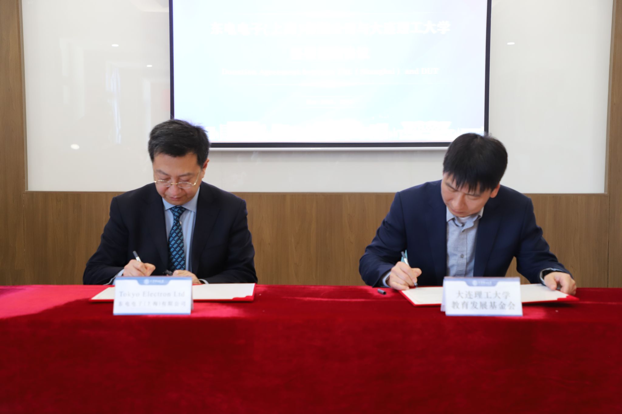 东电电子(上海)有限公司钱立群总监与大连理工大学国内合作与联络处处长杨克旭签署捐赠协议。