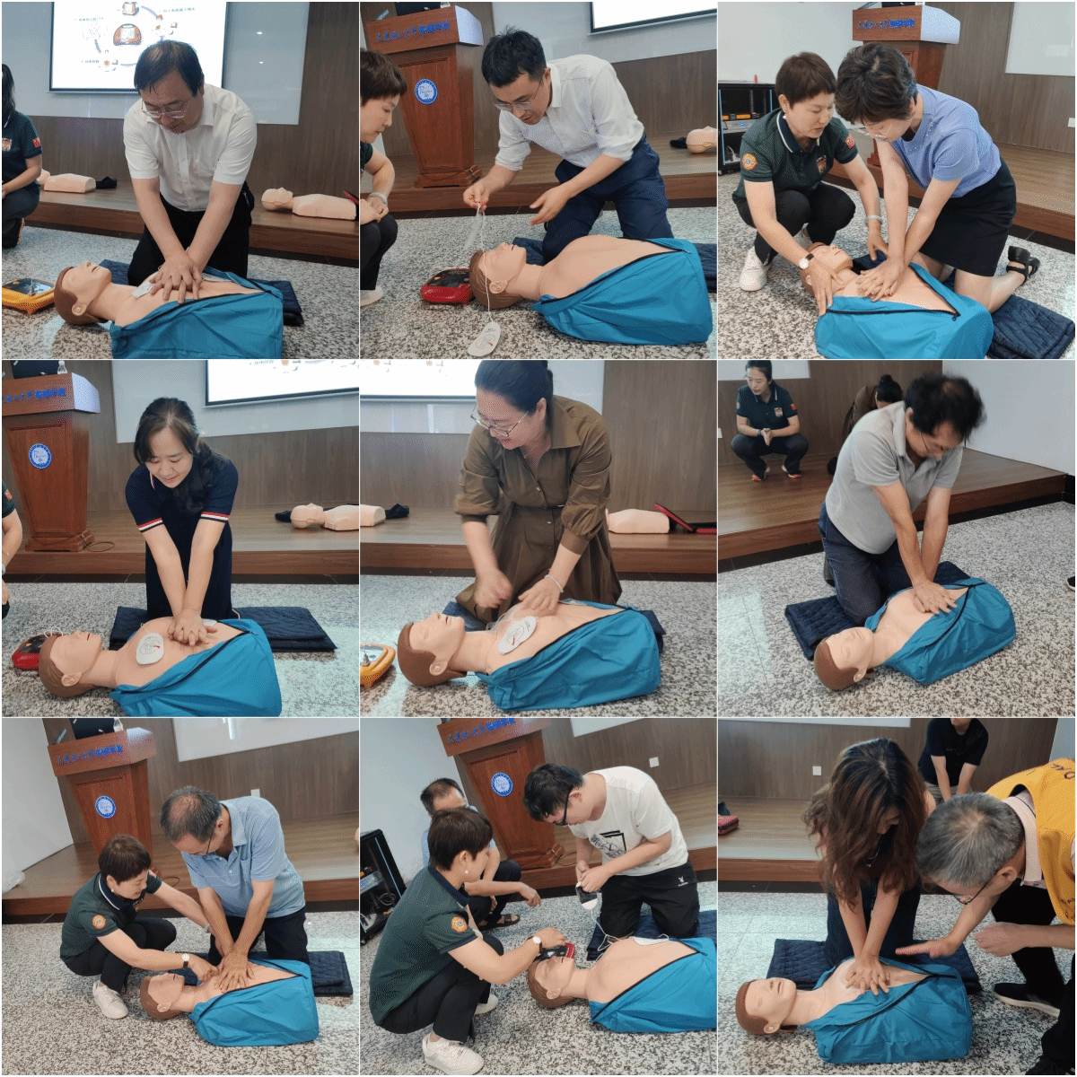 首先,由曲老师为现场人员带来一场题目为《一堂救命课》的讲座,曲老师采用理论讲解和现场模拟操作相结合的方式,凭借丰富的教学和实践经验,着重讲解了心肺复苏、自动体外除颤器的使用、心脑血管疾病及自然灾害的防护与逃生等方面的知识。曲老师的讲解通俗易懂,参加讲座的人员积极与老师互动,现场学习氛围浓厚。与曲老师一同来到讲座的其他工作人员在曲老师的指引下为现场人员进行实操展示。
