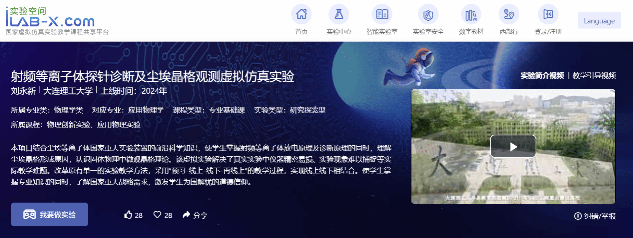 本项目结合尘埃等离子体国家重大实验装置的前沿科学知识,使学生掌握射频等离子体放电原理及诊断原理的同时,理解尘埃晶格形成原因,认识固体物理中微观晶格理论。该虚拟实验解决了真实实验中仪器精密易损、实验现象难以捕捉等实际教学难题。改革原有单一的实验教学方法,采用“预习-线上-线下-再线上”的教学过程,实现线上线下相结合。使学生掌握专业知识的同时,了解国家重大战略需求,激发学生为国解忧的道德信仰。