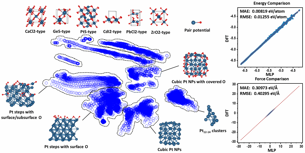 大连理工大学高峻峰教授团队长期致力于发展高精度、高效率的机器学习力场及主动学习策略,并将其应用于新材料预测、生长机理及表界面催化过程等研究。在本工作中,高峻峰教授与常远博士后构建了涵盖铂单质、不同氧化程度的铂台阶面、PtO团簇及多种PtO单晶表面模型,通过DFT计算生成了包含约16万组结构?能量?力对应关系的数据集,并以此训练出能够准确描述Pt-O体系相互作用的机器学习力场。