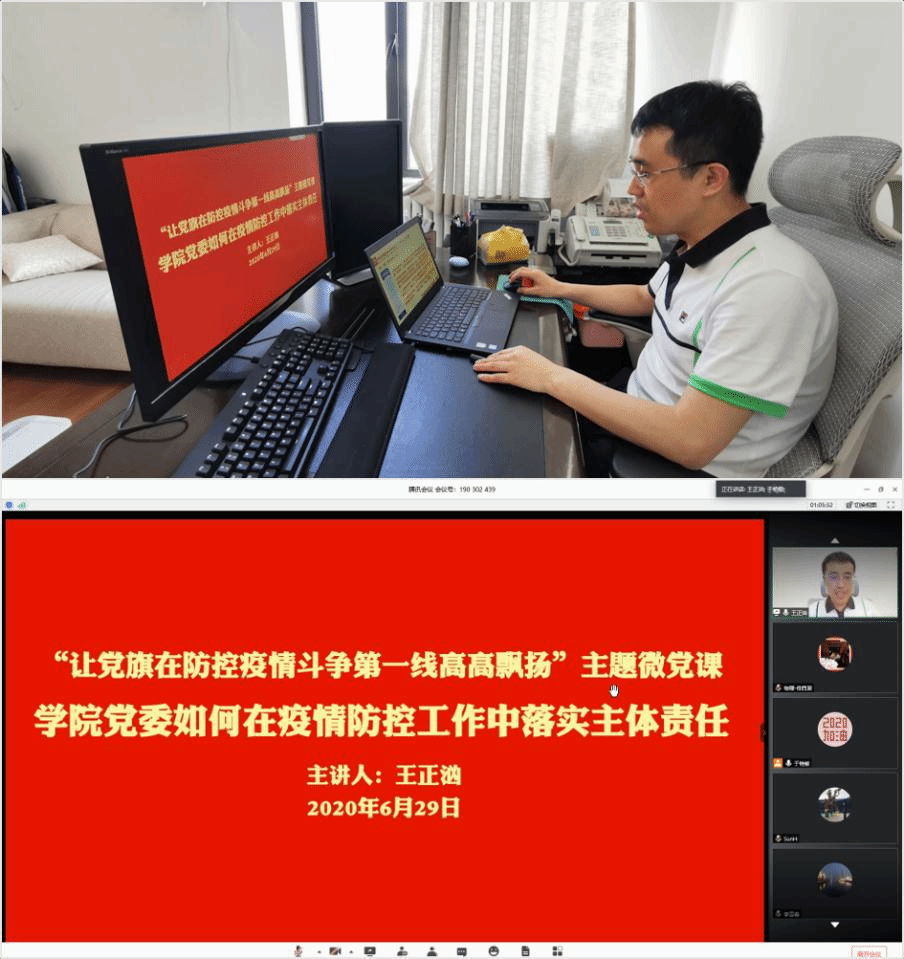 6月29日,开云在线登陆入口-开云(中国)党委书记王正汹以网络报告形式为全院师生党员上了一堂题为《学院党委如何在疫情防控工作中落实主体责任》的微党课。王正汹通过阐述“主体责任”概念和介绍《党委(党组)落实全面从严治党主体责任规定》中党组(党委)的责任内容,强调“学院党委落实疫情这一特殊时期的主体责任,就是要深入学习贯彻落实习近平总书记关于疫情防控工作重要讲话和指示精神和党中央关于疫情防控工作的决策部署”;通过对开云在线登陆入口-开云(中国)疫情防控工作的阶段性总结,向参与疫情防控工作的师生党员表达感谢,激励学院各支部各党员继续充分发挥基层党组织战斗堡垒作用和共产党员的先锋模范作用。