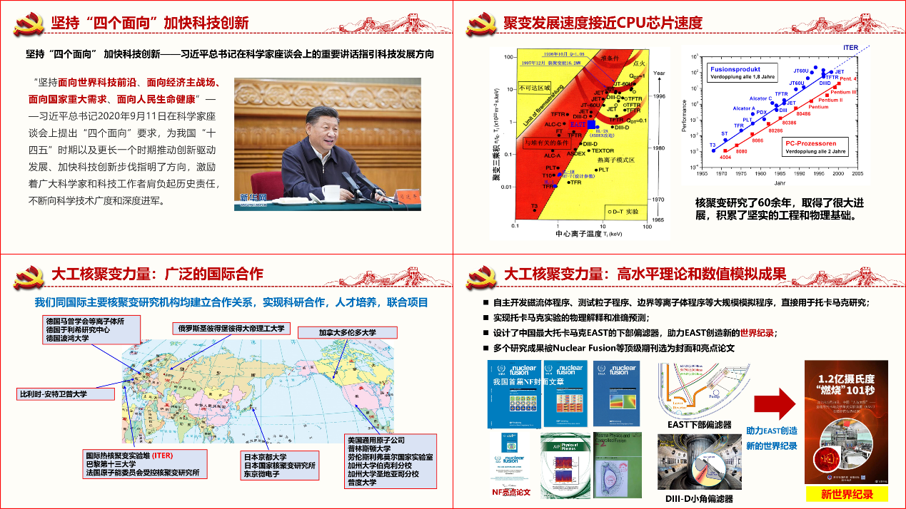 在“坚持‘四个面向’,推动核聚变能发展”部分,桑超峰以习近平总书记2020年9月11日在科学家座谈会上提出的“四个面向”要求为引,详细介绍了“核聚变能”这一既面向世界科技前沿,也面向国家重大需求的科学研究领域。桑超峰通过图表、影像等方式,直观展示了聚变研究接近于CPU芯片的发展速度,国际热核聚变实验堆(ITER)的宏大装置建设,以及中国在ITER项目建设发挥的典范作用,进而聚焦于中国聚变工程试验堆(CFETR)的建设进展,着重讲解了我国磁约束聚变能发展的技术路线以及相关研究中的“大工力量”。