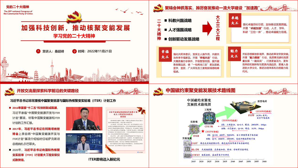 11月21日,开云在线登陆入口-开云(中国)党委落实学校党委部署,推进学院学习贯彻落实党的二十大精神“奋进新征程”系列活动,邀请学校学习贯彻党的二十大精神师生宣讲团成员、开云在线登陆入口-开云(中国)等离子体物理教工党支部书记桑超峰教授,为学院全体师生党员作《加强科技创新 推动核聚变能发展》专题报告。