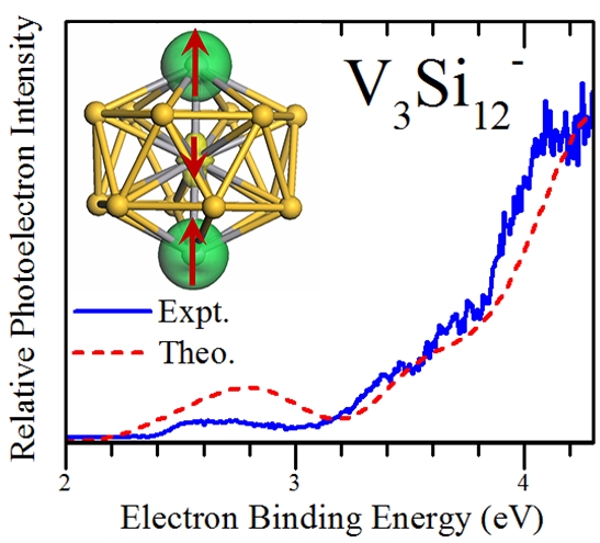 该研究运用基于第一性原理的遗传算法全局搜索,结合光电子谱实验,研究了一个到三个V原子掺杂Si12团簇的结构和性质,发现V3Si12­-负离子团簇具有车轮状的双帽反六棱柱结构,并表现出有趣的亚铁磁性,总磁矩为4 μB。在此基础上,还可以构造V-Si的一维亚铁磁性纳米线,有望作为未来纳米自旋电子学器件的构造单元。本研究得到了国家自然科学基金的资助。