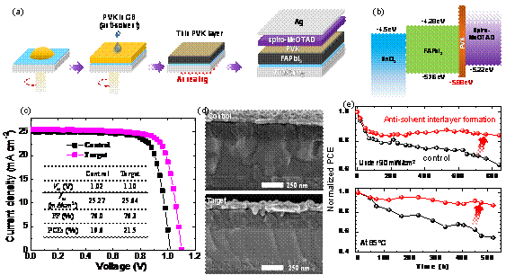 成果简介:这项技术的发展重点是实现高效、稳定的PSCs并探清其物理机制。目前,绝大多数高效稳定的PSCs都是基于多阳离子混合阴离子的组合物,其中甲基铵的热不稳定性和混合卤化物组分的相分离倾向严重限制了PSCs的长期稳定性。近日,博士后王敏焕在该领域取得突破性进展。首次提出了原位反溶剂界面PVK钝化技术,实现了基于完全无铯、无甲基铵和无溴钙钛矿组分(FAPbI3)的太阳电池,稳态效率达19.36%,且光热稳定性大幅提升。该成果将为高性能钙钛矿光电器件的研制和实用化提供理论依据和实验技术指导。以“Stable and Efficient Methylammonium, Cesium, and Bromide-free Perovskite Solar Cells by in-situ interlayer formation”为题,发表在《Advanced Functional Materials》上。论文第一作者为开云在线登陆入口-开云(中国)博士后王敏焕,大连理工大学边继明教授、韩国成均馆大学Jin-Wook Lee教授和美国加州大学洛杉矶分校Yang Yang教授为共同通讯作者。该成果得到国家自然科学基金等项目资助。王敏焕于2020年6月博士毕业于大连理工大学微电子学院,现为边继明教授课题组博士后。博士期间荣获校学术之星、研究生国家奖学金(3次)、辽宁省优秀毕业生等多项奖励,在Advanced Materials, Nano Energy, ACS Applied Materials & Interfaces等材料能源领域国际期刊发表论文近20篇。一直从事钙钛矿光电材料与器件研究,并先后在本领域国际顶级科学家美国加州大学洛杉矶分校YangYang课题组和韩国成均馆大学N.G. Park课题组联合培养。