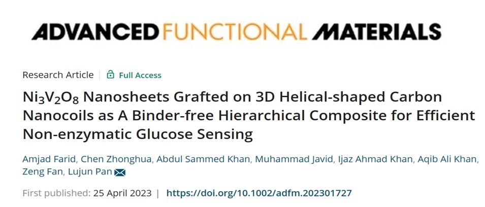 近日,我校开云在线登陆入口-开云(中国)潘路军教授课题组在高效葡萄糖检测的新型非酶葡萄糖传感器(NEGS)研究上取得突破性进展,相关成果“Ni3V2O8Nanosheets Grafted on 3D Helical-shaped Carbon Nanocoils as A Binder-free Hierarchical Composite for Efficient Non-enzymatic Glucose Sensing”在国际期刊Advanced Functional Materials上发表。研究成果对于定量、可靠的葡萄糖检测、糖尿病管理以及生物技术、制药、食品加工等领域都具有重要意义。
