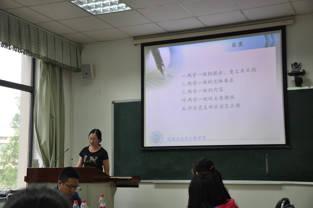 随后是谢灵骁同志,报告主要讲述了“两学一做”的学习内容、目的,并归纳了作为研究生党员应该做到的几点要求。结合实际情况,讲述了作为一名研究生,一名毕业生如何做到深入学习,做实做细。