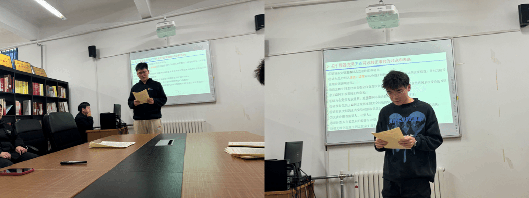 会议伊始,张宇同志介绍支部情况,并强调关于党组织关系转接事宜的通知,提醒毕业生及时按照党的规章制度完成党组织关系转接事宜。随后,张宇同志介绍了预备党员的转正程序。首先,全体起立,奏唱国际歌。接下来,徐汪文同志和王森同志依次宣读转正申请书,对预备考察期内自己的思想、工作、学习等情况做出了总结,并提出自己的缺点与不足。徐汪文同志和王森同志的入党介绍人分别介绍两位预备党员的培养情况,并对其按期转正表明积极的意见;王鹏宇同志代表支委会向支部大会报告征求党员和群众等意见情况和支委会是否同意徐汪文同志和王森同志按期转正的意见;与会党员对徐汪文同志和王森同志能否转正发表意见。充分讨论后,进行无记名投票表决,推选唐雯同志和张燕霞同志为监票人和计票人。经投票表决,与会党员一致同意徐汪文同志和王森同志转为中共正式党员。支部书记张宇同志宣读支部大会决议。两名同志表示,在今后的学习和生活中将会更加严格地要求自己,争做先锋。