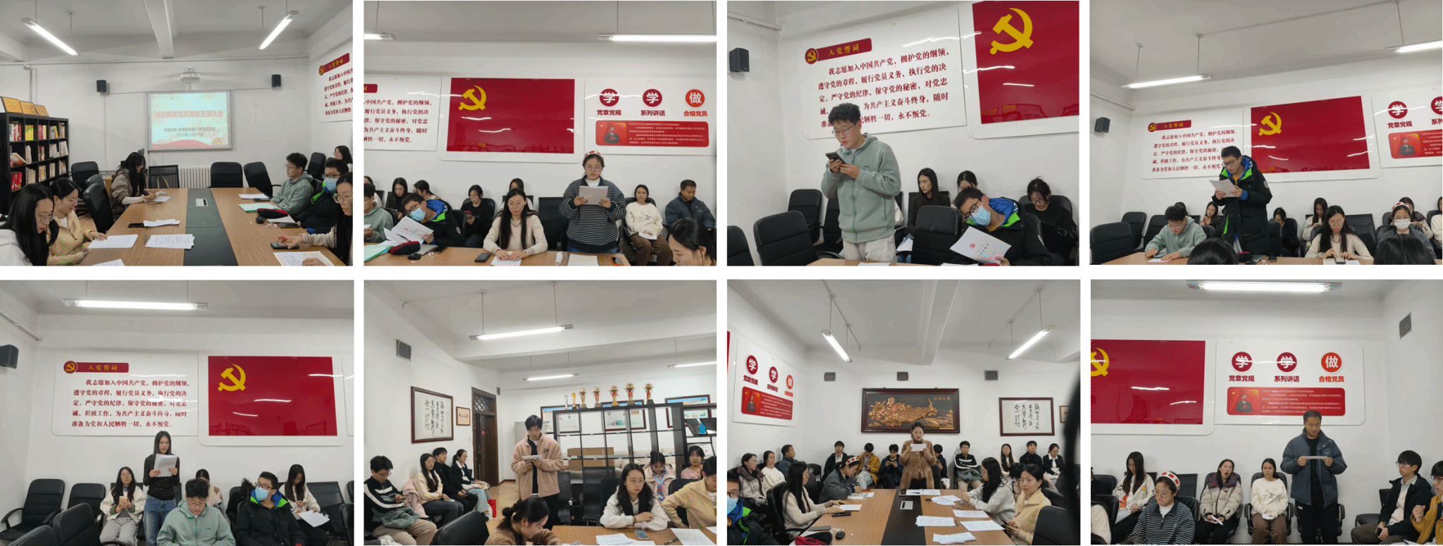 大会第二项,讨论接收孟卢花、张慧宁等四名同志为中共预备党员。首先,发展对象孟卢花、张慧宁、姜丰、林福鸿四位同志依次宣读入党志愿书,向大会汇报了自己对党的认识、入党动机、现阶段存在的优缺点和今后需要努力的方向,并表明了入党的决心。随后,入党介绍人分别发表了自己的培养意见,并对是否同意接收其为中共预备党员表明态度。接下来,组织委员余慧同志代表党支部委员会向大会报告了四名发展对象的政治审查情况、征求党员意见的情况。与会党员对四位同志的表现进行了客观评价,既肯定了在学习和工作中所付出的努力和取得的成果,又指出了现阶段仍存在的问题。经充分讨论和无记名投票表决,一致同意接收四名同志为中共预备党员。