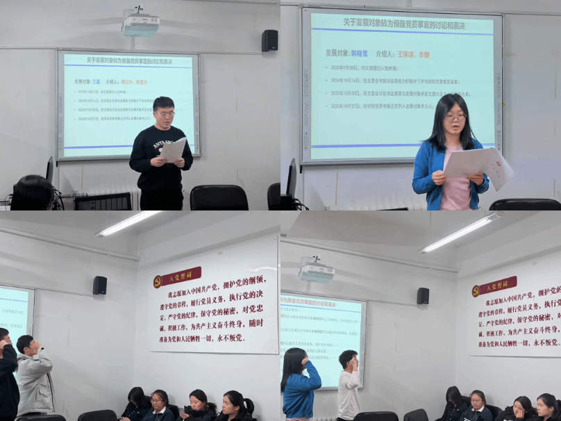 会议第二项,对接收王磊和韩晓雪两位同志为中共预备党员的事宜进行讨论和表决。首先,由两位同志分别宣读入党志愿书,随后各位入党介绍人分别介绍发展对象的主要情况,并对其能否入党表明意见。接下来,邢思雨同志宣读了党支部委员会意见。经过全体与会正式党员通过无记名投票表决,一致同意接收王磊和韩晓雪两位同志为中共预备党员。