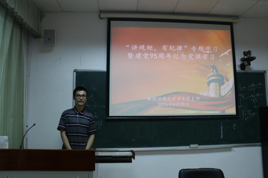 2016629日晚,物理硕博光学学生党支部在物理系楼425房间开展了“讲纪律,有规矩”专题学习暨建党95周年庆祝活动,围绕“两学一做”,集体深入学习“四讲四有”专题二“讲规矩,有纪律”。光学党支部9名正式党员、2名预备党员参加会议,支部书记王鹏主持了会议。