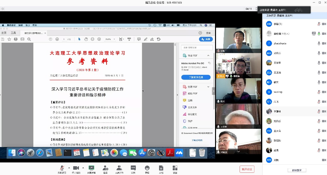 3月28日,等离子体物理教工党支部通过视频会议方式召开了新学期第一次组织生活会,支部全体党员出席会议。支部书记桑超峰同志首先带领全体支部党员进行《深入学习习近平总书记关于疫情防控工作重要讲话和指示精神》理论学习,指出学习要点,肯定了支部成员在疫情防疫工作中的积极表现,号召全体党员同志继续坚持理论学习不放松、充分发挥党员先锋模范作用。