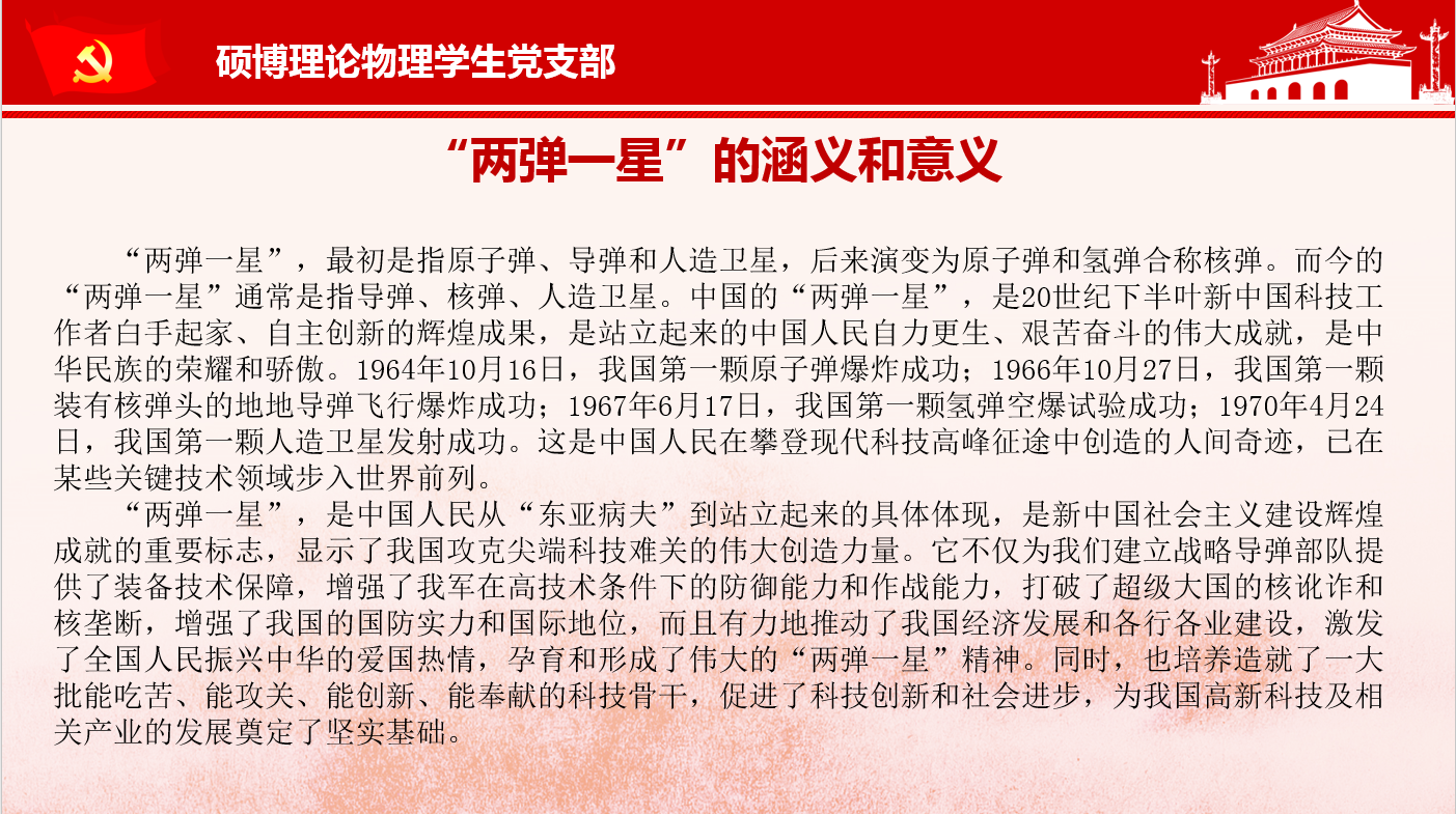 大会第二项为党课学习分享环节。首先由尚琳同志分享主题党课《中国共产党人精神谱系——"两弹一星"精神》。习近平总书记指出,“两弹一星”精神激励和鼓舞了几代人,是中华民族的宝贵精神财富。“两弹一星”精神展现了中国人自尊自觉的志气,彰显了中国人自强自立的骨气,奠定了中国人自信自豪的底气,是中国共产党人精神谱系的重要组成部分。作为新时代青年,我们要继承和弘扬“两弹一星”精神,自立自强,着力攻克科研上遇到的难题,扎实学习,练就过硬本领,在实现中华民族伟大复兴中国梦的实践中实现自己的人生价值。