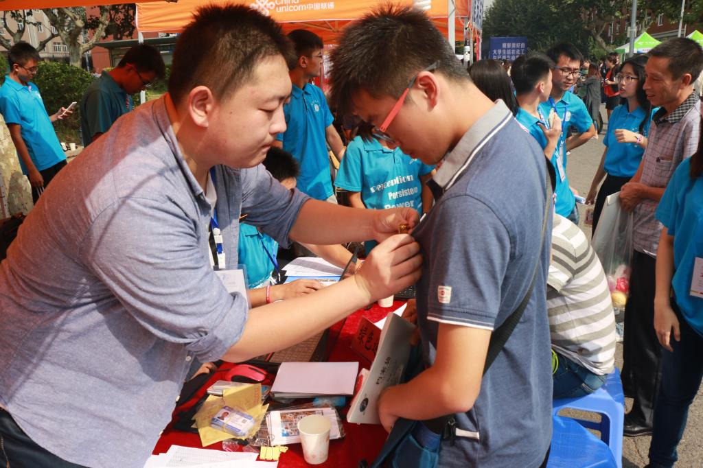 2016级各代班长向新生介绍开学注意事项,完成注册工作,并为他们佩戴大连理工大学校徽,贴心而又温暖。