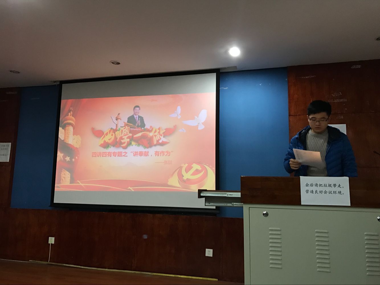 纳新大会的最后,新老党员在庄严而神圣的党旗下进行了宣誓,又一次表达了自己一生忠于党,服务于党和人民的决心与信念。纳新结束后,我们继续学习了“两学一做”专题教育的最后一课“讲奉献,有作为”。本次学习是以分享交流的形式,胡金耀,张喆等5位预备党员用PPT向我们展示了他们自己对这个专题的理解,分享了一些“讲奉献,有作为”的先进党员事例。与实例相结合,让我们更深刻意识到,“讲奉献,有作为”是每个党员应有的基本素质,我们应该时刻牢记并身体力行,努力做到“讲奉献,有作为”。