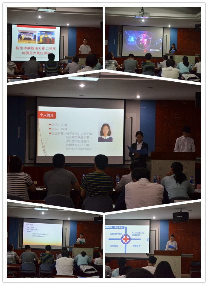 会议伊始,为确保评选的公平、公开、公正,本次评选答辩分为候选人自我展示,评选委员会投票,现场计票,宣读统计结果四个环节。每位候选人结合PPT进行为时3分钟的演讲,他们从个人思想品德、学习成绩、社会工作、经验心得等方面对自己的竞选理由进行阐述。