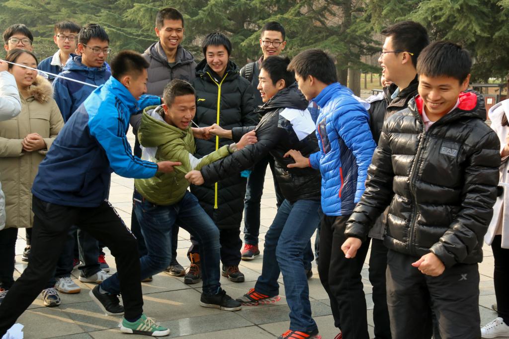 接下来,同学们被分为十组进行团队比拼。第一个游戏项目是“盲人方阵”,该游戏要求每组出五人将眼睛蒙上,其中一人指挥其他四人将绳子摆成正方形,这不仅提高了同学们的团队合作能力,还促使同学们积极思考,寻找在看不见的情况下如何快速准确地拼出正方形的方法。第二个游戏是紧张而激烈的“撕名牌”,游戏规则要求同学们只能在一定范围内走动,走动时不能撕他人名牌,当主持人喊停时,同学们脚不能移动,但是可以变换身体姿势撕他人名牌。这个游戏主要依靠同学们的勇气与应变能力,同时比赛中也很容易误伤队友,因此该游戏还考验了同学们对团队成员的了解与相互之间的默契。