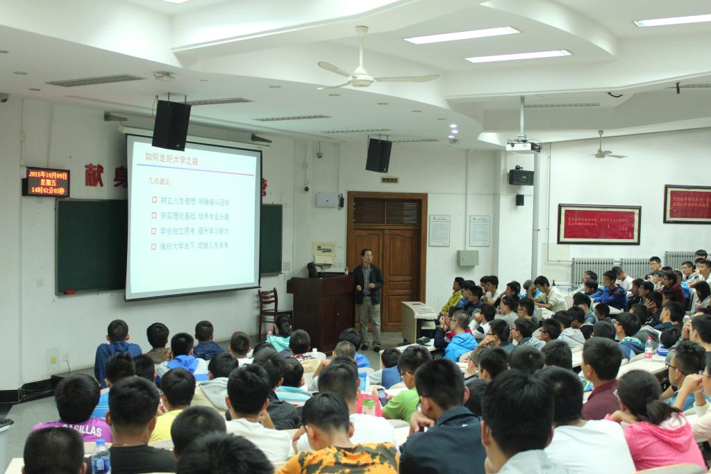 赵明山教授首先从学院基本情况介绍入手,结合学院院史院情以及“两系一中心”的机构设置特色,对学院的人才培养、教育教学、学科发展、专业方向等方面进行了全面的介绍,让同学们对学院的整体情况有了初步的了解。之后,赵明山教授作为新生的师长,从人才培养的角度出发,对全体新生提出了四点殷切希望,并将四点希望融入到学生的日常生活学习中,鼓励大家:树立人生理想,明确奋斗目标;夯实理论基础,培养专业兴趣;学会独立思考,提升学习能力;做好大学当下,成就辉煌未来,同学们听后深受鼓舞。最后,赵明山教授以光子学领域为依托,浓墨重彩的为新生同学们介绍了物理学科各专业方向的应用领域、发展前景以及理论前沿,并强调:物理学科在21世纪仍是整个科学技术领域中的一个带头学科,物理学的进展仍将是推动整个自然科学发展的一个最重要的动力!