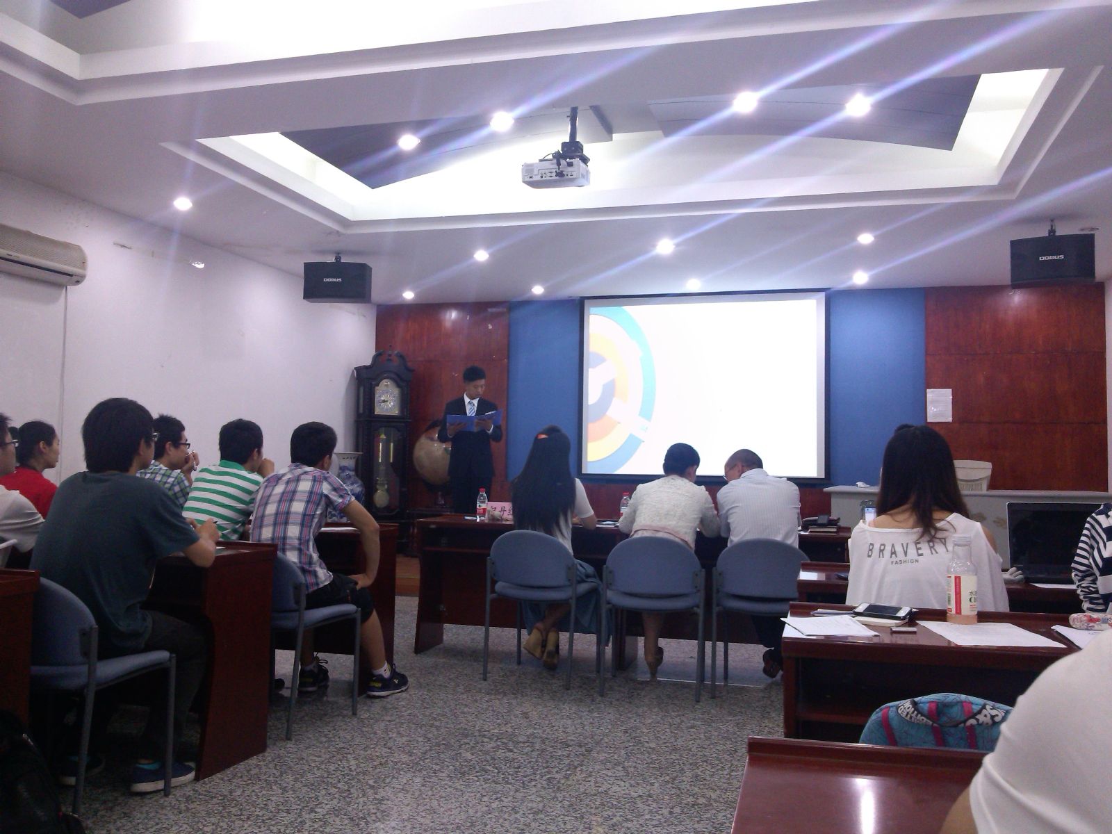 自09年物理与光电工程学院开展优良学风班建设立项机制以来,学院设立一笔专项资金用来鼓励学风建设中表现出色的班级,以此来促进学院整体学风建设。本次评比以检查各班优良学风建设进度为契机,以各班级间相互学习、相互促进为目的。评比展示分为论述和答辩两个环节,展示完毕由评委现场打分并书写评比意见。参选班级从班级组织建设、思想政治教育、学风建设、文化建设、文体活动、寝室建设等方面进行了为时5到8分钟的展示,各班的展示形式多样,新颖别致,风格各异的幻灯片,将2012级学生团结向上、生机勃勃的一面展现得淋漓尽致。评比活动一直在紧张、欢愉、和谐的气氛中进行。展示结束之后,杨木老师代表评委们总结了各班的成果和不足。