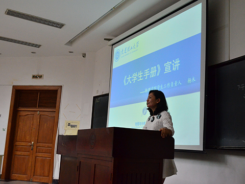 而对于学生工作及纪律方面则由杨木老师负责说明。杨木老师从奖励政策与违纪处分两个方面对14新生进行讲解教育,详细地阐述了奖学金政策及纪律规定。相信通过杨老师的讲解,同学们能更好地了解大学的相关规章制度,更好的在大工生活学习。