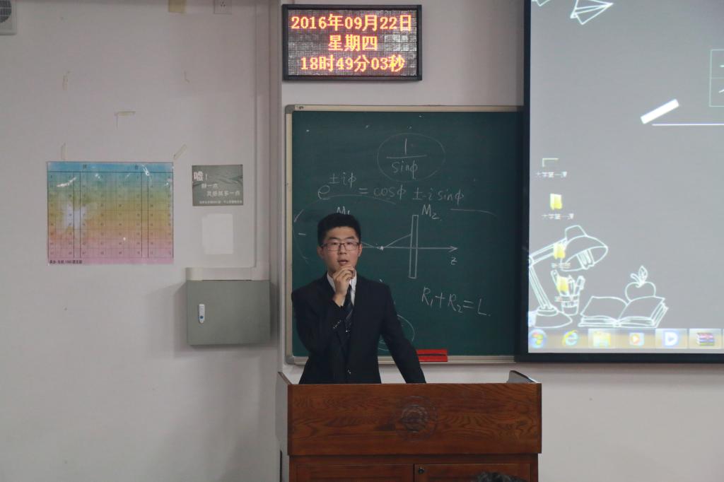 9月22日晚六点半,物理与光电工程学院团学社招新宣讲会暨大学第一课在西综B403顺利举行。出席本次会议的有学生会主席王序涛,团委常务副书记刘婉莹,学生会、团委各部门部长。2016级新生们全体到场,大家都跃跃欲试,期待加入物理团学社大家庭。