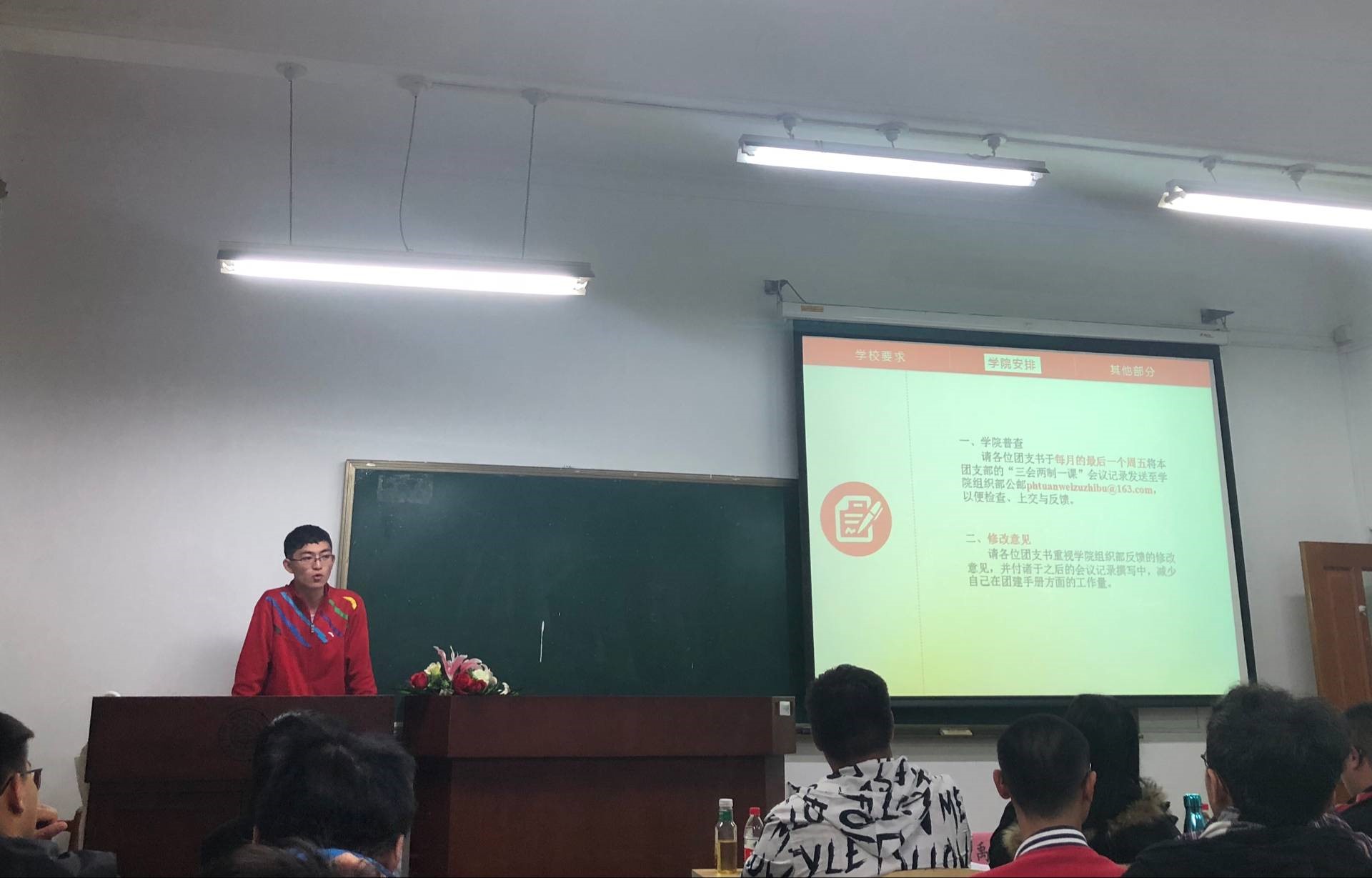 说明会开始后,由何浩对团支部建设的具体事宜进行了介绍,其中包括团支部建设的内容及基本要求、评比方法、注意事项等事宜,同时,他还就今年团校管理的一些改变做了一些说明。他强调院校对于各团支部建设工作会进行抽查,希望各级团支书能认真做好团支部建设工作,同时,他展示了一些较为优秀的团建手册,通过实际的例子引导团支书的工作走向规范化。最后他还从团支部新浪微博建设、团支部平台建设等方面对团支部宣传工作建设进行介绍,着重强调宣传委员工作的重要性。