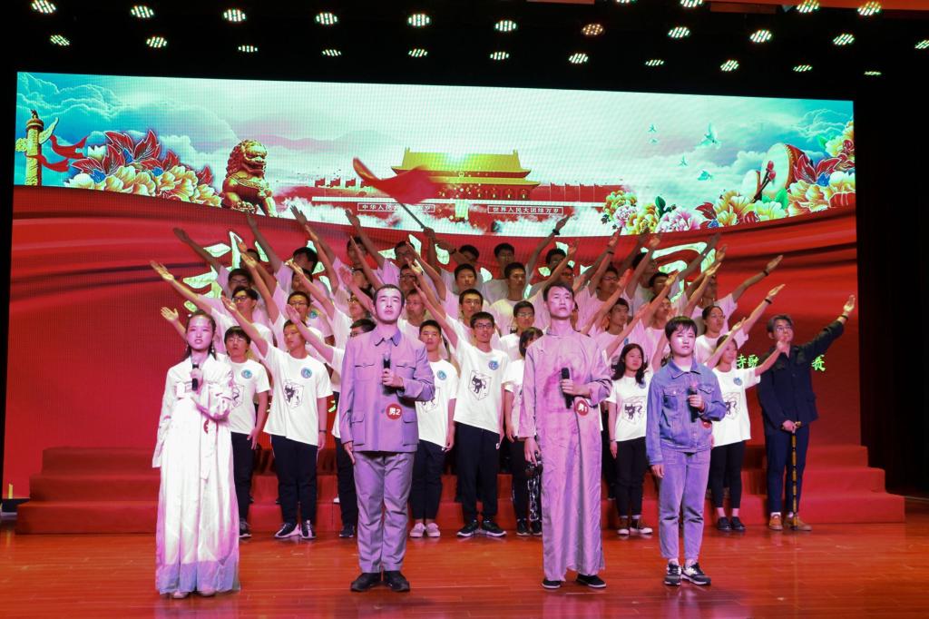 物大珩1901团支部演出主题为祖国与青年的对话,时间线贯穿古今。古风美人优雅动人,代表古代中国的盛世;近代烈士手戴镣铐,悲痛地讲述屈辱历史;开国元勋沉稳刚毅,领跑于祖国复兴之路;当代学生意气风发,誓将热血献予祖国。“在百废待兴的时代里,在茫茫无尽的黑暗中,先辈们的爱国热情,曾烛照复兴之路”。而今,“新时代的大工人,新时代的物理人,勇担时代之责任,以奋斗自成芳华”。