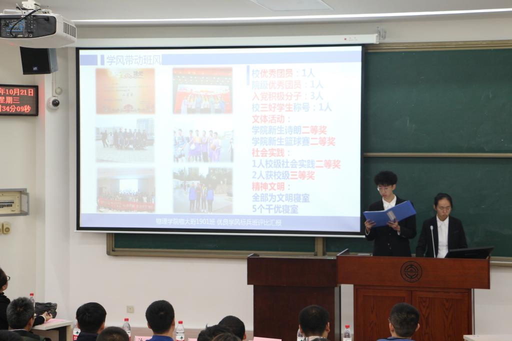 参与本次评优大会的班级有物大珩1801、物应1801、物大珩1901,物应1901。在大会正式开始后,四个班级的答辩选手依次上场。九层之台,起于垒土。四个班级都不约而同地选择大一时确立的目标作为切入点,叙述在入学不久后班级就定下了全班一起前进的目标。答辩选手们通过班级的挂科率、活动参与度、科创成果、四六级通过率、奖学金获得人数等方面来展示优良学风建设取得的成果,同时他们也讲述了过程中遇到的困难及解决方法,其中不乏以班级为单位学习、以寝室为单位学习,成立学习小组、一帮一学习等模式。各个班级之间既有相同的模式,也有与众不同的方法。例如物大珩1801班开发使用微信小程序“作业助手“来提醒同学们做好时间规划、物应1901班与物大珩1901班实行“晚自习查寝”模式以确保同学们有足够的学习时间。答辩过程结束后,评委老师根据班级学习风气、学习成果、现场展示效果等指标进行评分。