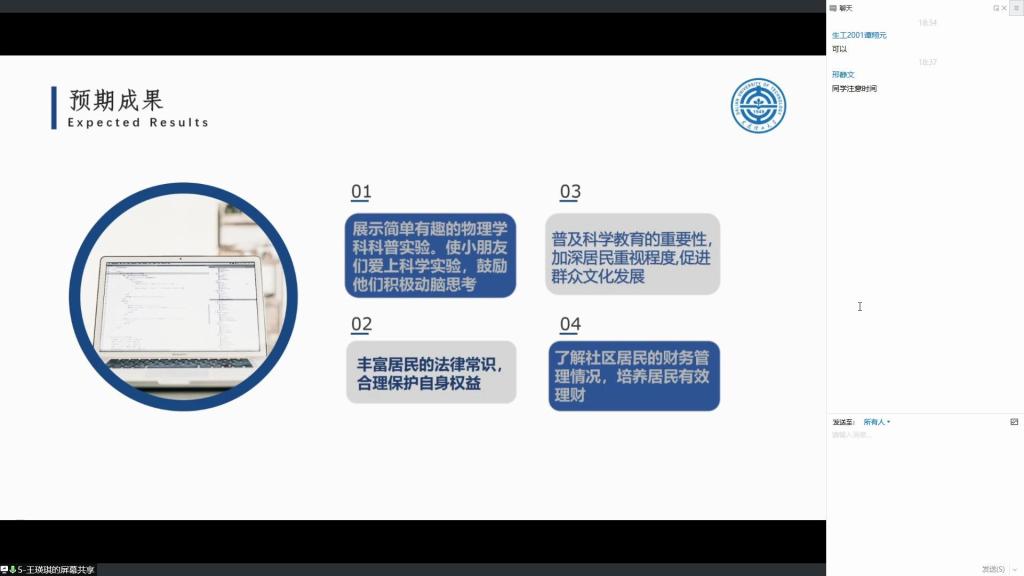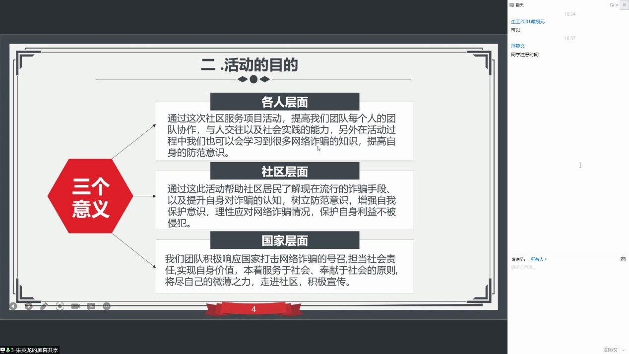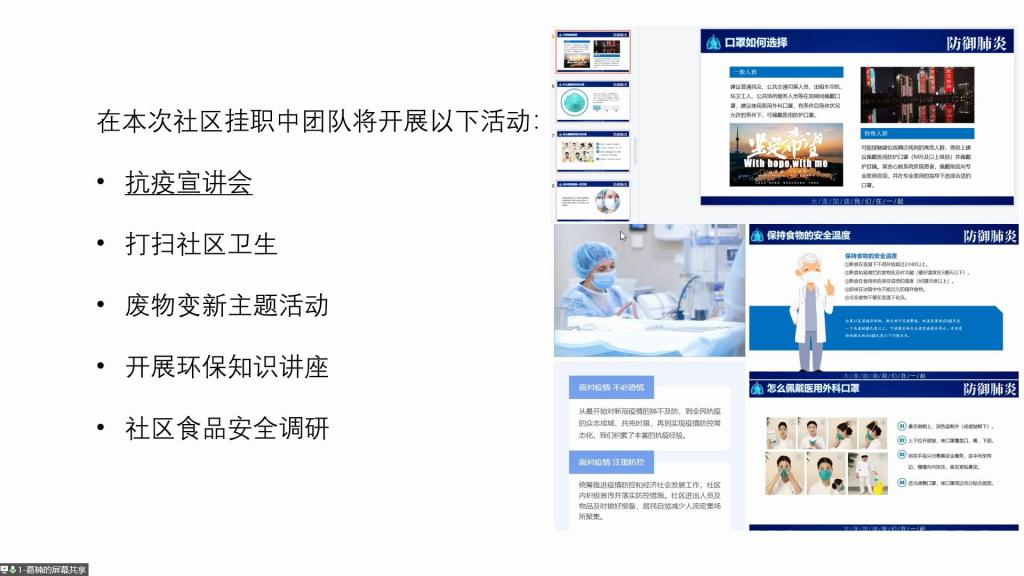 本次答辩共五支队伍参加,分别有4支队伍主题为“深入社区,开展社区宣传”,1支队伍主题为“调研社区,服务社区发展”。服务团队围绕全面建成小康社会、共抗疫情贡献青年力量、垃圾分类助力文明城市等核心思想,精心策划,并针对活动的具体形式,活动时间及方案等做出详细介绍。宣传类社区服务项目主要有举办社区宣讲,,制作宣传手册,张贴宣传海报、条幅,拍摄心理剧等精彩项目;调研类服务项目则有线上调查问卷,开展物理知识科普,走访社区调查等细致规划。评委们认真听取各支队伍的精彩发言,并针对活动可行性及活动预期成果做出提问及点评。